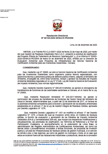 - Instrumento de Gestión ambiental aprobado por el MINAM con Resolución Directoral Nº 00138-2020-SENACE-PE/DEIN “Planta de Tratamiento de Residuos Cajamarquilla».