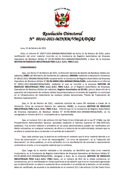 - Registro autoritativo de Empresa Operadora de Residuos Sólidos EO-RS- 00039-2021-MINAM/VMGA/DGRS