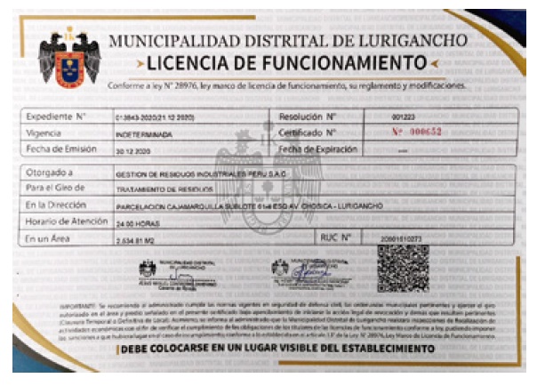 - Licencia de funcionamiento por la municipalidad de Lurigancho-Chosica